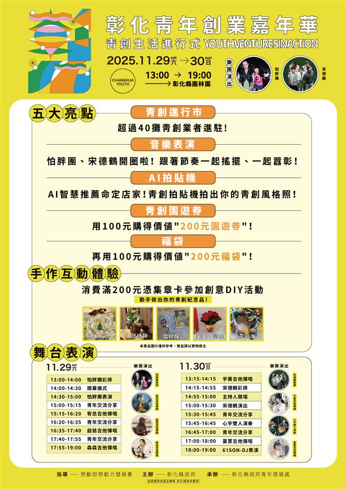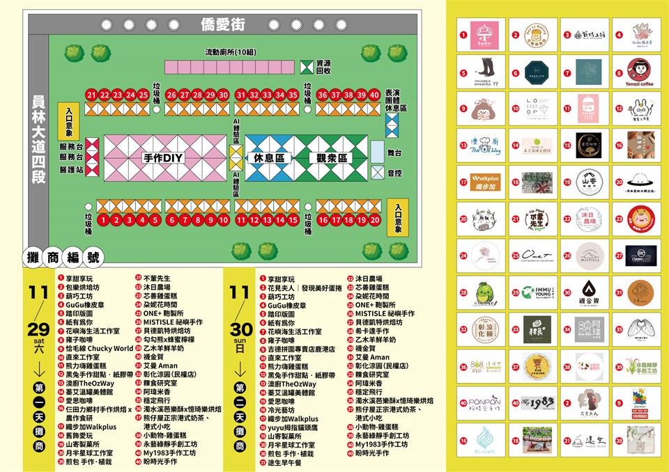 活動邀請超過40組特色攤位,涵蓋餐飲、農特產及文創手作等領域,恍如一座移動市集。今年特別推出「雙倍園遊券」,讓大家把手中的新台幣變大,民眾只要以100元即可購買價值200元的多樣化商品及美食,攤商更加碼推出以100元購買價值200元的限量福袋,內含多樣精美禮品,邀請大家以實際行動支持在地優質青創產品,在午後時光的人潮,感受彰化動人的文化魅力。