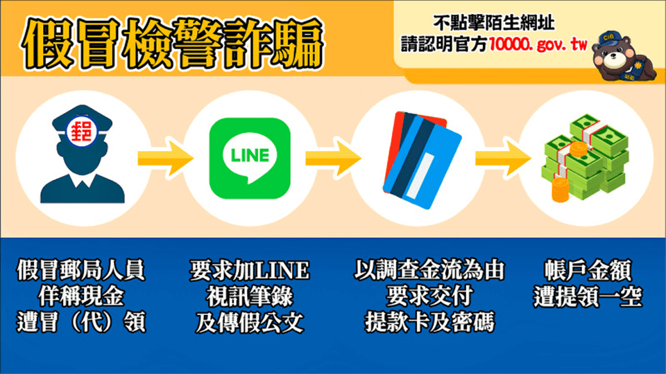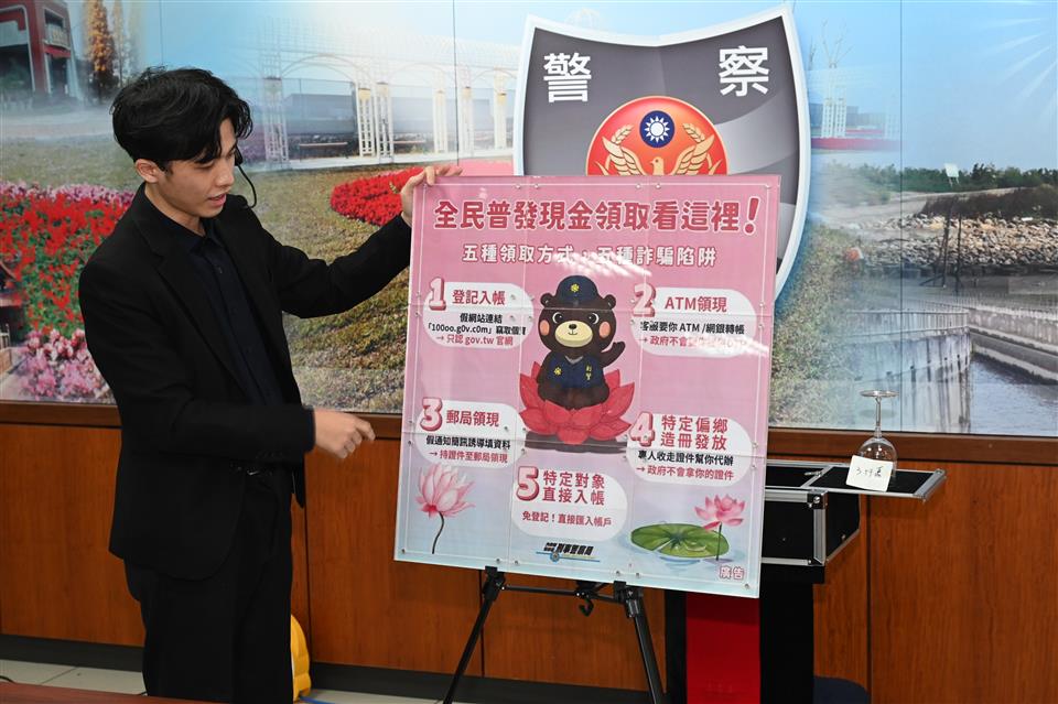 局長陳明君呼籲,政府普發現金僅限官方公布的合法管道,絕不會透過陌生簡訊連結、社群訊息,或要求操作ATM、提供帳號密碼與OTP,更不會派員到府「協助領取」。只要對方主動聯繫、催促點擊連結、要求繳交「手續費、保證金、稅金」,幾乎都是詐騙;同時也提醒民眾提高警覺「假檢警詐騙」,詐騙集團常假冒檢察官、警察或調查局,以「帳戶涉案、需要監管」為由要求匯款或提供銀行存摺、提款卡;陳局長強調,司法機關絕不會以電話偵辦案件,也不會要求匯款或提供金融帳戶。請民眾務必冷靜查證,「不點、不回、不匯款、不依指示操作ATM」,遇到疑似普發現金或假檢警詐騙情形,請立即撥打165反詐騙專線或洽轄區警察單位查詢,共同守護辛苦所得。