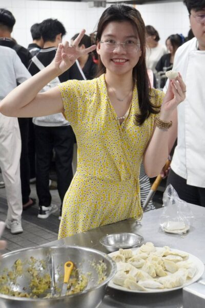 餐旅管理學系講師林言叡從桿皮、包餡到塑形,一步步示範,引導國際學生完成一顆顆手工水餃,同時告訴學生,水餃形狀類似元寶,因此過年吃水餃象徵招財進寶、財源滾滾。