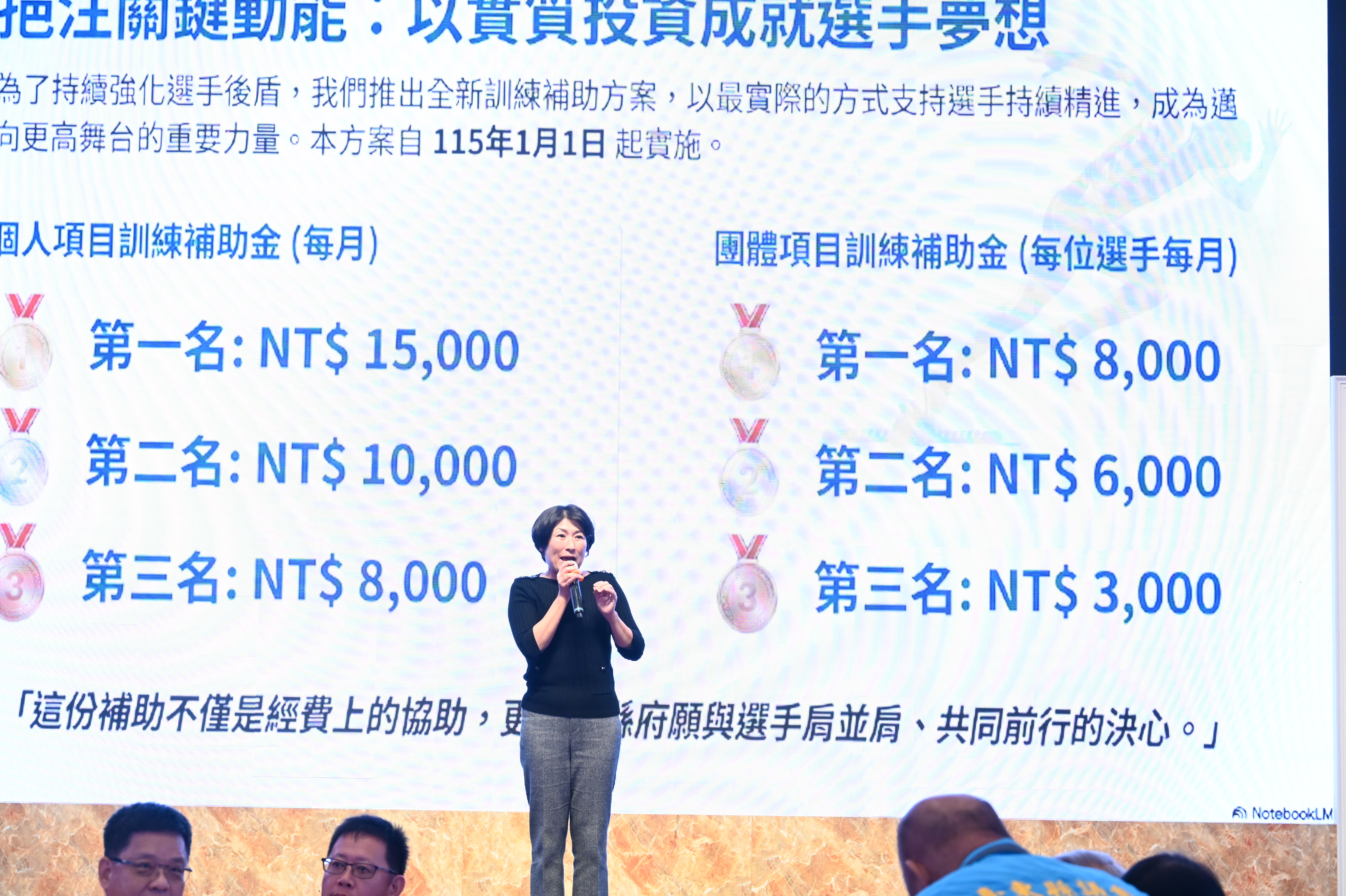 臺東縣府表示,為確保選手在競技領域持續精進,自115年起針對參加114年全國運動會並獲前3名之個人及團體選手,全面調升績優選手訓練補助金,個人項目部分,第1名每月補助1萬5千元、第2名每月1萬元、第3名每月8千元;團體項目,每位選手依名次分別補助每月8千元、6千元及3千元,提供選手經費挹注,彰顯縣府與選手並肩前行決心。