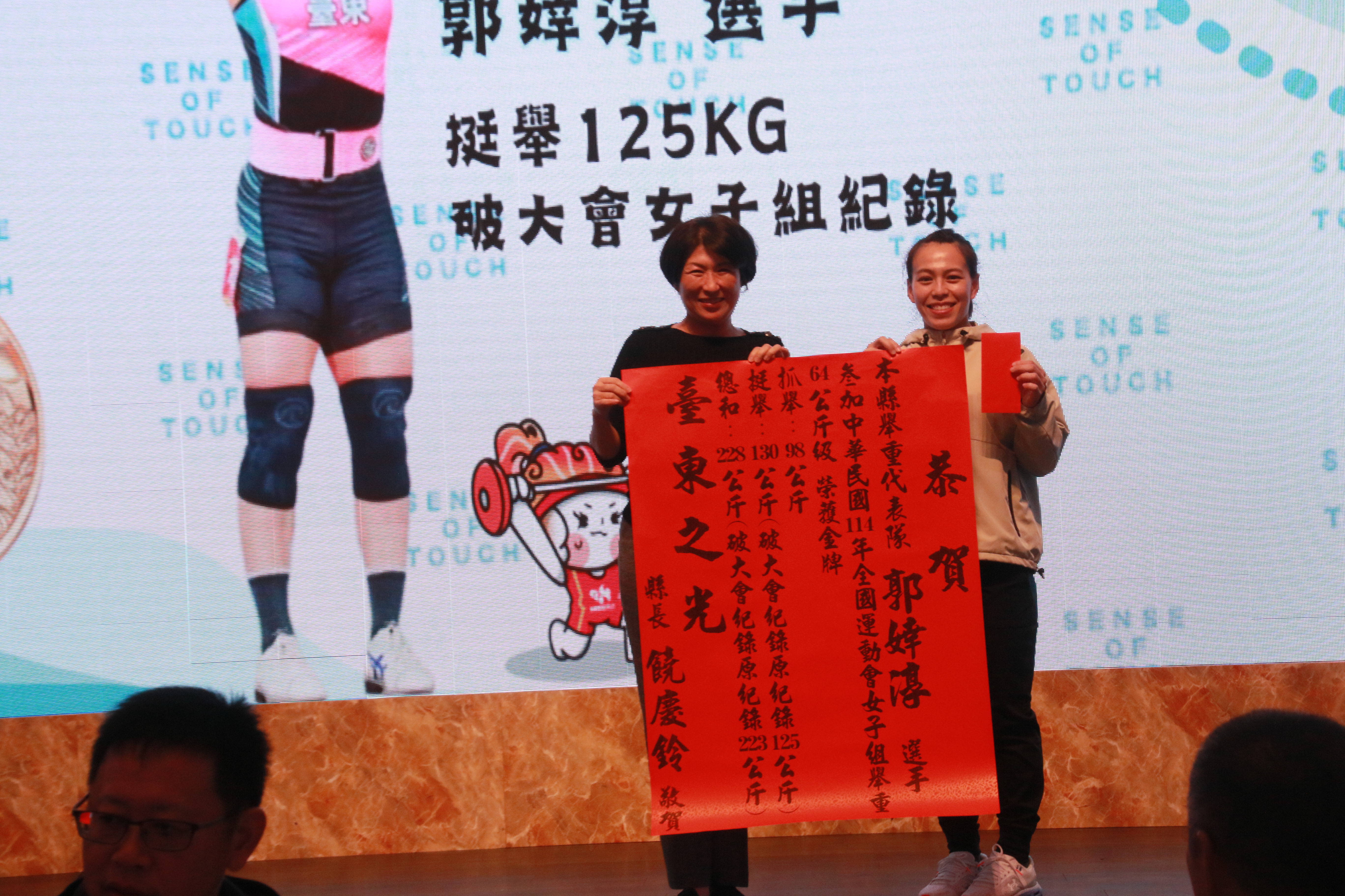 慶功聯歡晚會溫馨隆重,饒慶鈴、臺東市長兼體育會理事長陳銘風、臺東縣議會議長吳秀華、議員王文怡、臺灣中油東區營業處長張瑞春、臺東縣警察之友會榮譽理事長粘昭焰、副理事長張睿鈞、總幹事陳中岳、臺東區漁會理事長陳志和及代表隊總教練李正淼等貴賓參加,「舉重女神」郭婞淳也返鄉共襄盛舉。饒慶鈴感謝選手平日訓練及賣力比賽,未來持續投入更多資源,完善訓練設施、提升運動環境,為年輕選手創造更多培育機會。