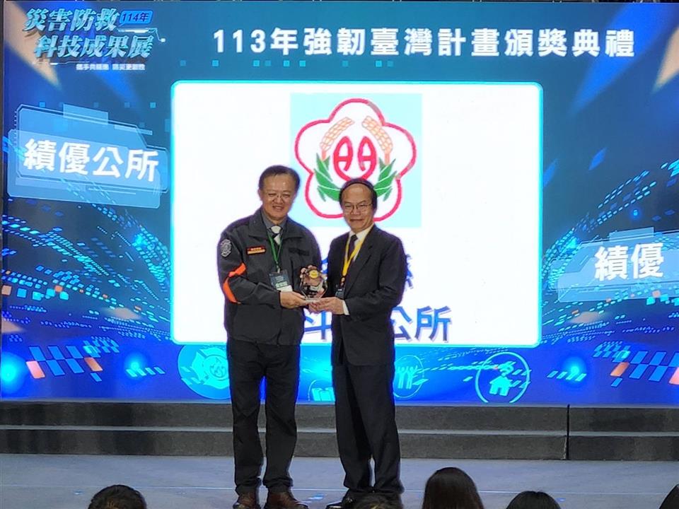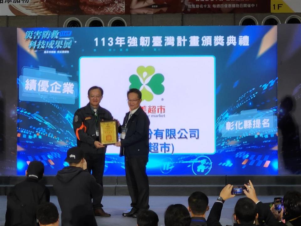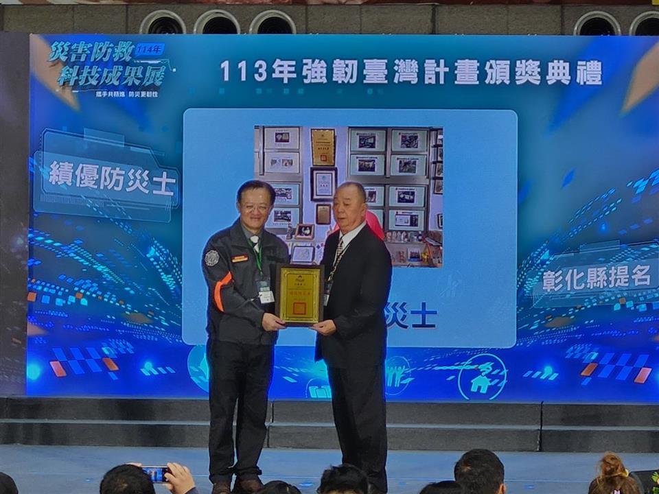 彰化縣災害防救績優團隊,於114年底前往台北車站多功能展演廳接受表揚。獲獎績優單位包含北斗鎮公所、績優企業金喜美股份有限公司、績優韌性社區北斗鎮中寮社區,以及卓越表現的防災士代表秀水鄉馬興村范鎱楨,由內政部消防署蕭煥章署長親自頒獎,肯定本縣多年來持續努力的成果。
