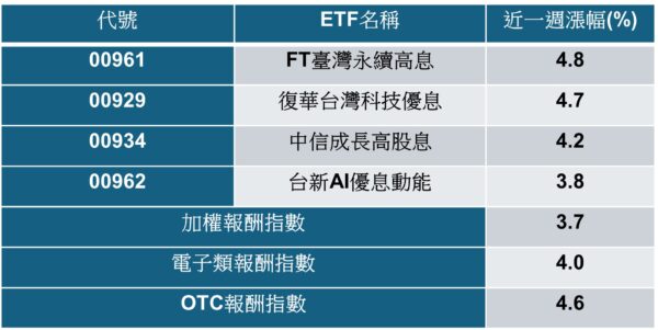觀察近一周績效表現,共有四檔高股息ETF脫穎而出,表現均優於大盤。其中 FT臺灣永續高息(00961)以4.8%漲幅奪冠,復華台灣科技優息(00929)則以4.7%緊追其後。中信成長高股息(00934)與台新AI優息動能(00962)也分別繳出4.2%與3.8%的佳績。值得注意的是,00961、00929與00934的漲幅甚至超越了電子類股,成為盤面上吸金焦點。
