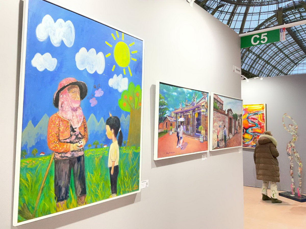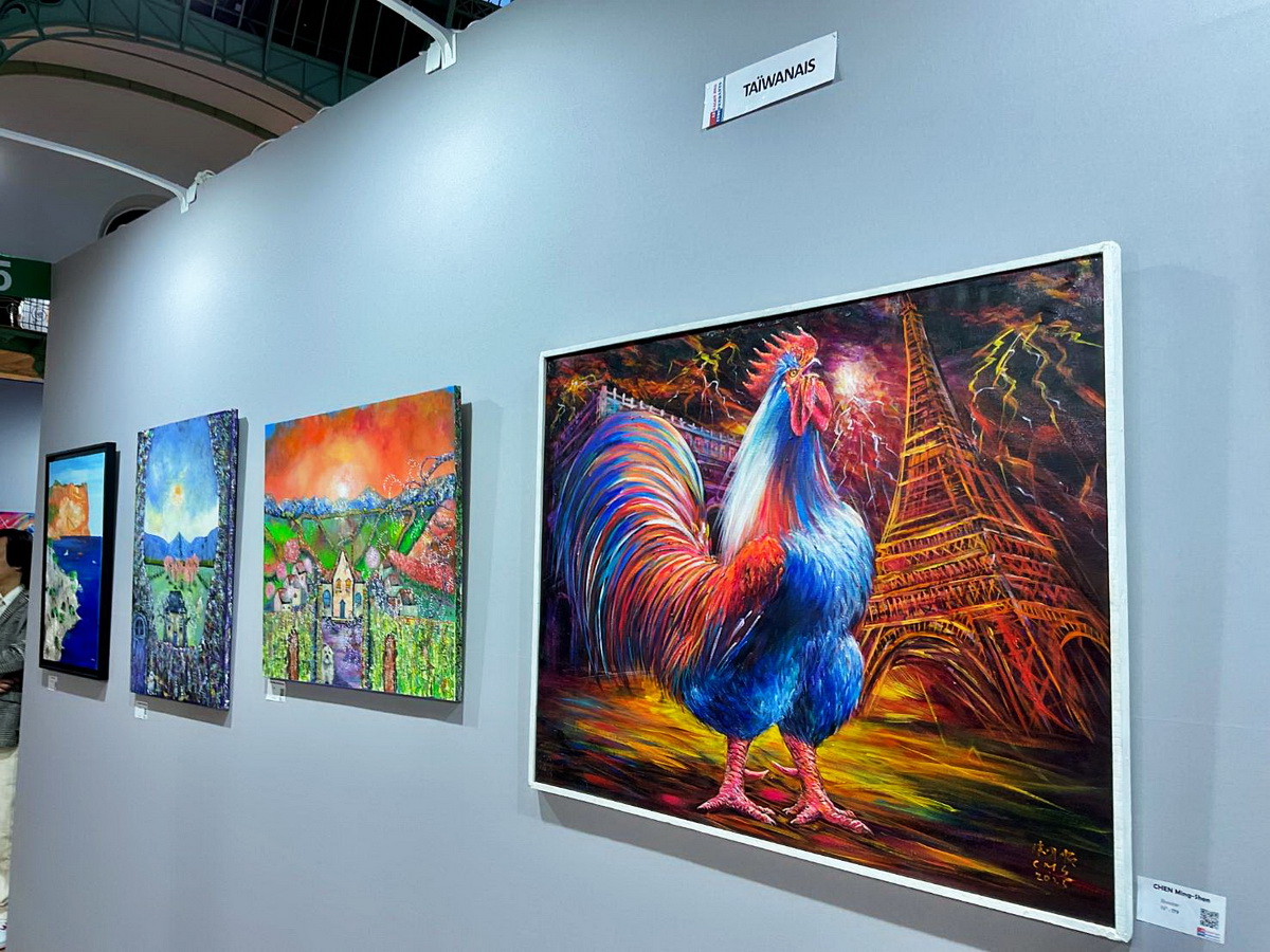本次展覽不僅是藝術交流的平台,更象徵台灣藝術家在國際舞台上的持續突破與努力。陳明順藝術家以雞成家有德,融合易經乾坤陰陽,再融合現代藝術之父法國塞尚之形體不存在藝術理念,將以藍白紅色系表現自由,平等,博愛的法國國旗色彩,皇宮展覽會場,最難能可貴的是大會特於圖上方標示法語台灣,增添了台灣藝術家的活力與世界美術同為追求世界真善美,令人感動。(圖/記者黃信峯翻攝)