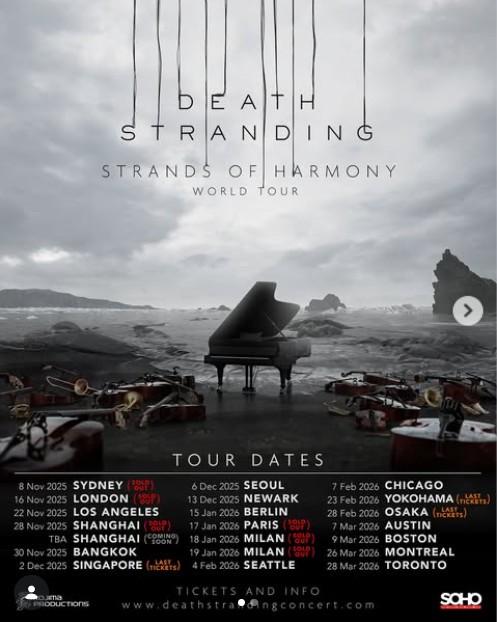 2025 年 11 月,《死亡擱淺:Strands of Harmony》世界巡演正式啟動,首站於澳洲雪梨登場。巡演以《死亡擱淺》及其續作音樂為核心,結合影像與現場管弦樂演出,將原本的互動式配樂轉化為完整的交響音樂會形式。巡演橫跨歐洲、亞洲、北美與大洋洲共 19 座城市,包括倫敦、洛杉磯、上海、首爾、巴黎、柏林、橫濱、大阪、芝加哥、蒙特婁與多倫多等地,展現遊戲音樂在全球劇場舞台上的文化影響力。