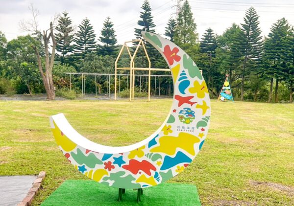 「月之海Chill造型椅」以潮汐律動象徵自然循環,結合月亮的圓潤意象、桃園珍珠海岸CIS色彩與Logo設計,將地方特色與形象融合。