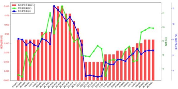 00929 在 2023 年 6 月掛牌後,一開始每月均維持極度穩定的 0.11元月配息,快速獲得廣大投資人的高度認同,緊接著2024 年上半年月配息隨著優異績效表現一路向上衝向 0.2元,年化配息率一度上攀至雙位數的巔峰,但隨著全球科技股劇烈回檔與配息政策的調整,00929開始進入了長達一年多的沈潛期,月配息一度落入 0.05 元的低潮,年化配息率墜落至僅3%,市場一度質疑00929是否已經失去原有光環,然而,這段時間正是00929重新整頓與蓄積修復力的重要時刻,就像是謝征身負重傷化名為「言正」的隱忍時期,重整旗鼓後,00929 終於迎來了屬於它的高光時刻,去年5月起,00929配息重回上升軌道,先是調升至0.07元,8月起連續三次配發0.08 元,11月再調至0.09元,今年1月調升至0.1元,3月更進一步加碼至0.11元,創下逾一年來新高,股價更一度上攀至 20.6 元的近期高點,順著這股「回升韌性」的趨勢,最新4月公告配息再次向上調升至0.13元,較上月暴力升息幅度高達18%,以3月31日收盤價19元計算,年化配息率上衝至8.2%,完全擺貼去年降息低潮,正如謝征重新披上鐵血戰甲,重掌兵權的震撼感,正式宣告「武安侯」的回歸。