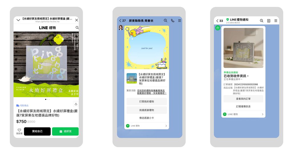 LINE 台灣攜手屏東縣政府推動「今天好屏友計畫」,今(11/18)日宣布將極屏獎金獎《永續好屏》「午後時光禮盒」上架 LINE 禮物商城,正式將南台灣的在地好物推向全台市場。此計畫自 2024 年底啟動,透過「今天好屏友」官方帳號與 LINE Beacon 技術串聯線上與線下體驗,結合數位科技與城市觀光資源,為屏東注入數位創生能量。LINE 台灣執行長陳立人表示,LINE 希望運用便利的數位工具,協助地方店家與消費者建立互動,並推動地方永續發展與繁榮。