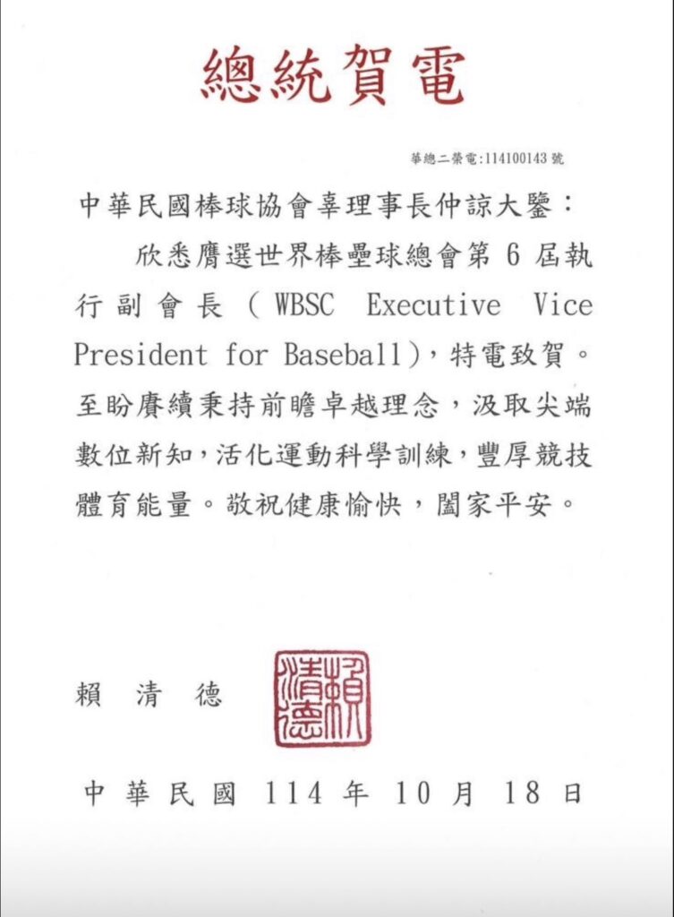 值得注意的是,在大會正式投票前,辜仲諒獲頒WBSC「金鑽榮譽獎章」(Order of the Golden Diamond),成為本屆唯一獲此殊榮的亞洲棒壇人士。WBSC特別指出,他長年致力於亞洲棒球教育與基層推廣,不僅是金融界的企業領袖──中國信託金控大股東、中信兄弟隊的推手──更是讓臺灣棒球在國際舞臺持續發聲的關鍵人物。