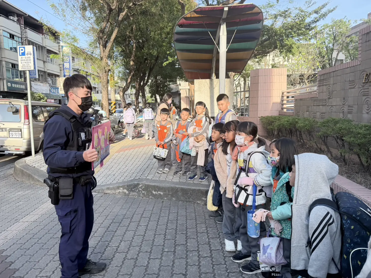 水湳派出所警員林冠汶、廖羿甄巡邏行經北屯區陳平國小時,適逢放學人潮聚集,兩人靈機一動,拿出巡邏車上的宣導手板,直接在校門口與學童來一場即席宣導。員警引用生活中常見的手機遊戲、網路互動情境,提醒孩子上網時不要輕易相信陌生人話術、不得洩露個人資料或家長資訊。