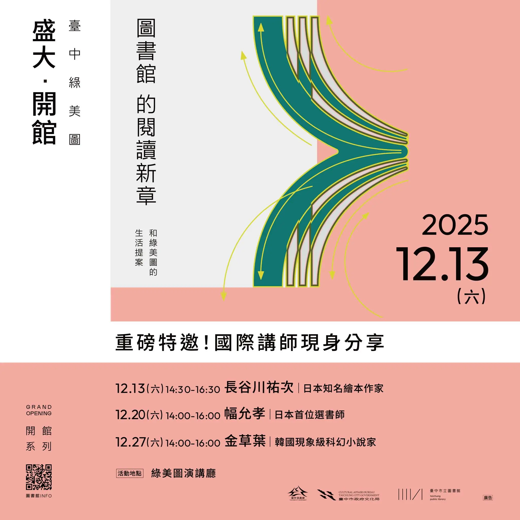 臺中最新文化地標「綠美圖」將於 12 月 13 日正式開館!這座全臺首座結合市立圖書館與市立美術館的大型公共空間,不僅是建築落成,更象徵臺中邁向國際閱讀與文化交流的重要一步。中市圖特別邀請三位國際級講者——日本繪本作家長谷川祐次、日本第一位「選書師」幅允孝、韓國科幻小說作家金草葉,於 12 月連續開講,帶來跨越繪本、策展到科幻創作的閱讀饗宴。