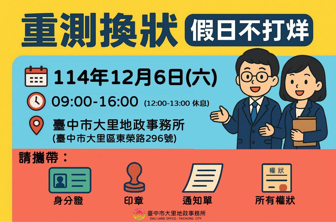台中市霧峰區慶堡北段地籍圖重測成果已於今年10月31日公告期滿。為方便平日難以抽空到地政機關辦理換狀的土地所有權人,台中市政府地政局特別推出「重測換狀假日不打烊」便民服務,提供市民更具彈性的辦理時段。地政局說明,大里地政事務所將於12月6日(星期六)上午9時至12時、下午1時至4時開放專案假日換狀服務,並同步設置地政法令宣導及諮詢櫃檯,由專業人員現場提供解說。為配合市府反詐騙政策,現場亦可申辦「地籍異動即時通」及「指定送達處所」等服務,協助民眾提升不動產交易安全,歡迎多加利用。