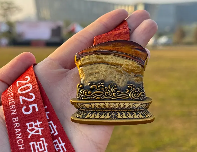 適逢故宮百年與南院開館十週年,賽事推出全新參賽禮與限量紀念品,包括以北宋范寬〈谿山行旅圖〉為構圖的紀念巾與提袋,以及今年最受矚目的「肉形石」獎牌。該獎牌與前兩年「毛公鼎」及「翠玉白菜」合組「故宮三寶—酸菜白肉鍋」系列,跑者連續三年完賽即可集滿,收藏價值十足。