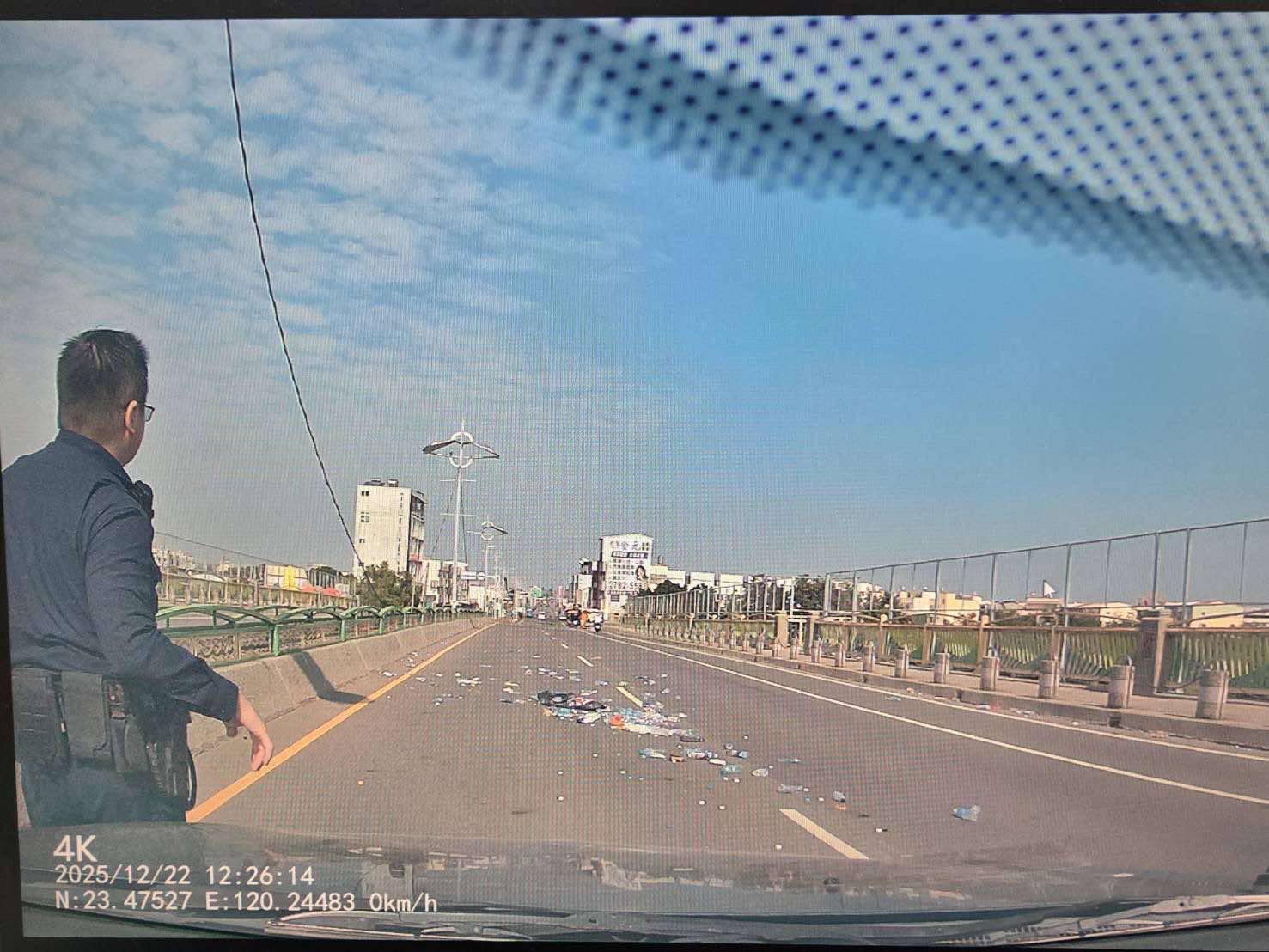 過程中,員警一邊留意來車狀況,一邊迅速將寶特瓶移除至路旁安全處,整個動作俐落果斷,成功消除潛在危險,也讓後方車流得以順暢通行。現場駕駛見狀,紛紛投以感謝與肯定的目光,肯定警方積極作為。